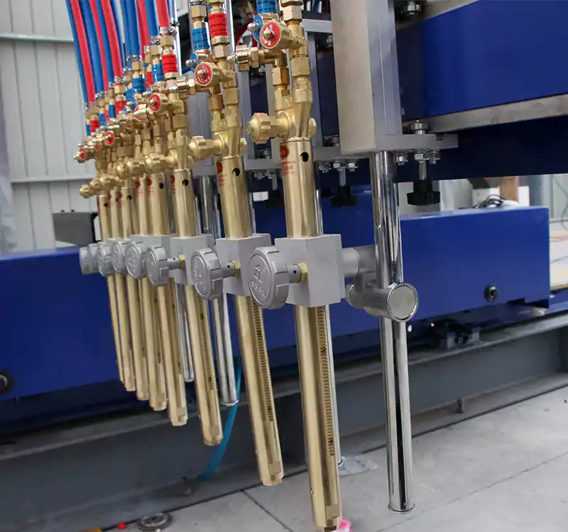 多把火焰割枪安装在数控切割机上,运行稳定,配置好,工作效率高,可用于各种碳钢、锰钢等金属材料的大、中、小型钢板裁条下料。可根据用户要求配置多把裁条割炬,也可根据需求配置数控异型割炬系统,可选配自动调高系统。用于直线形状零件的绘图、编程、套料、校验和数控切割。提高钢材套料率,有效节省钢材;提高编程、套料和切割工作效率,有效提高切割生产效率。